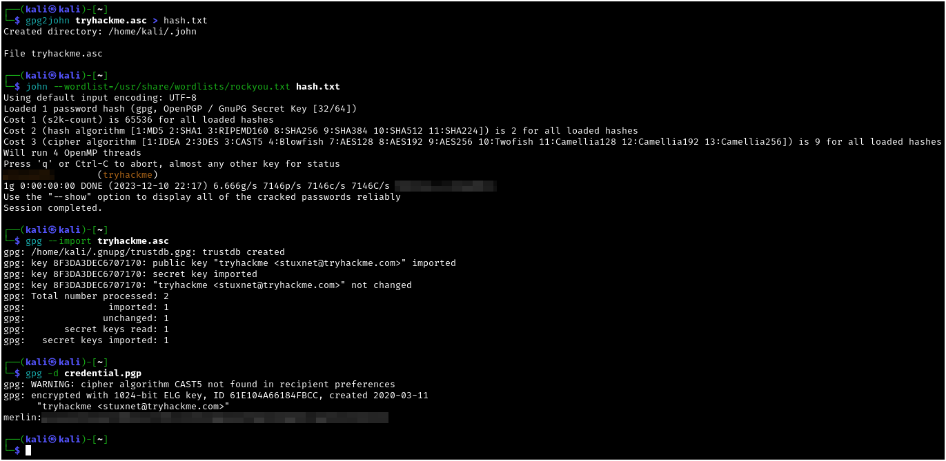 With the files now on my Kali host, I can run gpg2john against the ASCII file in order to get a hash to crack. Passing this hash to john gives me the password I can use to both import and decrypt the PGP file. After decrypting credential.pgp, we are given a “merlin” user’s credentials.