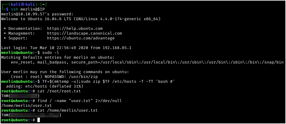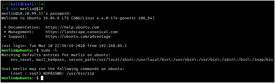 With these new credentials, I am able to ssh into the box with the merlin account. By checking programs we can run as root with sudo -l we are able to see that merlin is able to run zip as root: