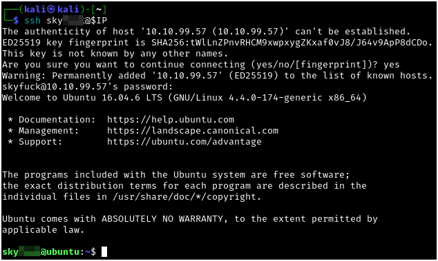 Now that we have some credentials for a user, which for the purposes of “keeping it professional” we’re going to refer to as “Sky” for the next two steps. Based on our port scanning, we know we have an SSH port open, so we could either try to look around for an admin portal on the Tomcat web server, or we could just jump straight to SSH and try to log in, which we will do successfully in this case: